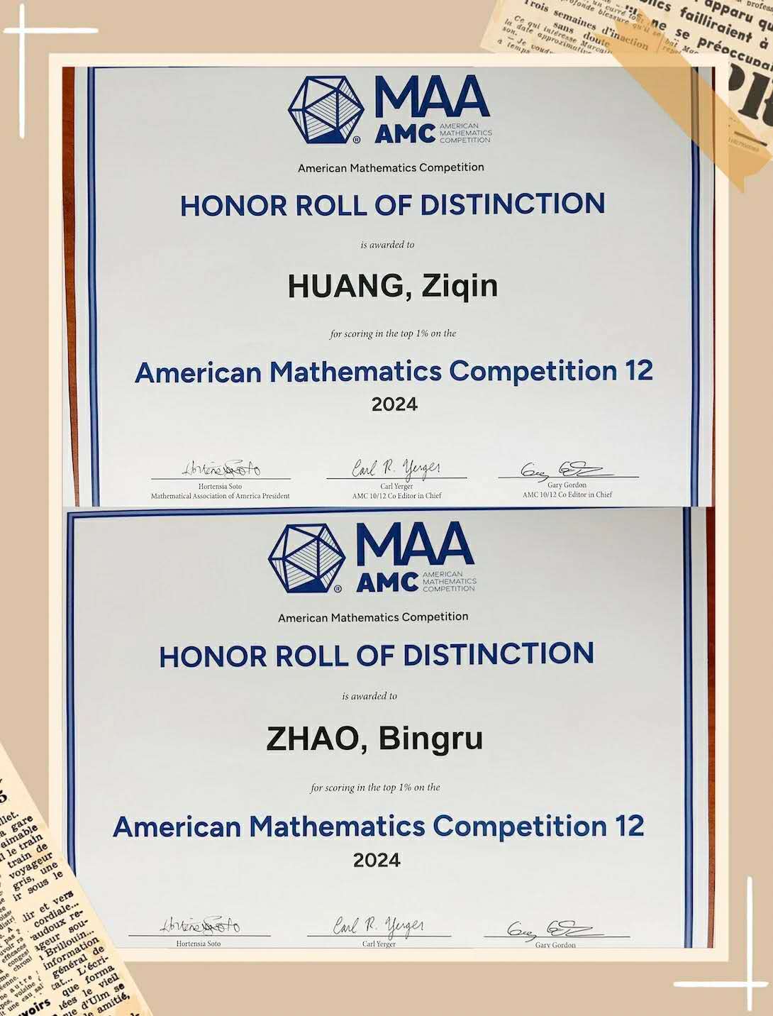 The remarkable success of Ziqin Huang and Bingru Zhao in the AMC competition is a testament to their passion for mathematics, years of dedicated effort, and expert mentorship. Their achievements demonstrate that genuine interest is the best motivator and that hard work is the foundation of success. As the university application season approaches, they are well on their way to securing offers from top Ivy League universities and pursuing their academic dreams.