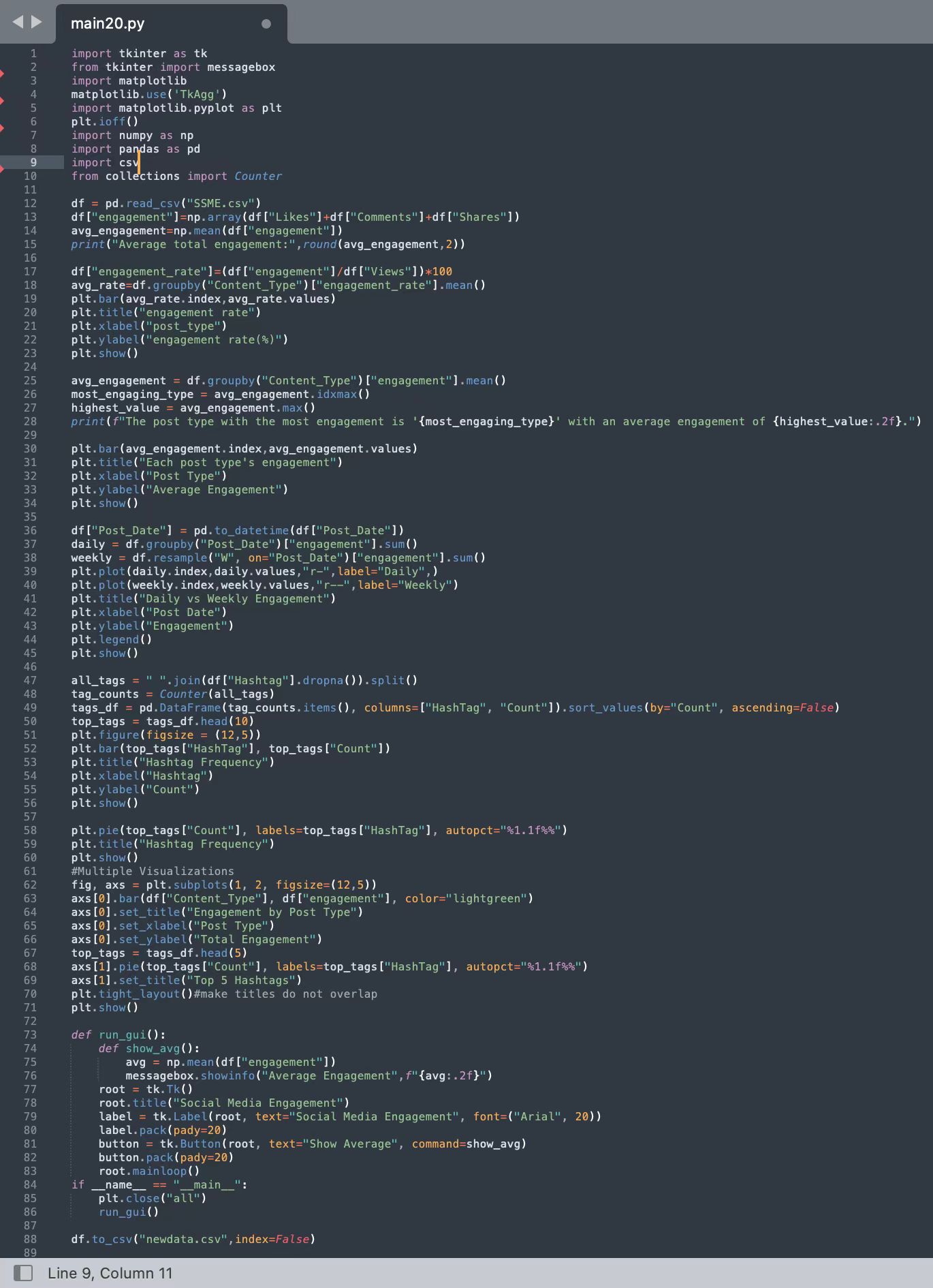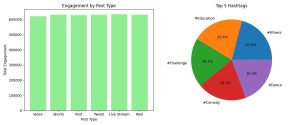 Behind this clear conclusion lies a rigorous data workflow. The student first used pandas to accurately read, filter, clean, and organize the dataset, ensuring the reliability of the analysis. Next, matplotlib was employed to define chart dimensions, label axes (such as post type and engagement rate (%)), and adjust bar colors and spacing—turning raw numbers into an intuitive visual narrative.
