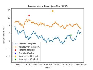 Using publicly available data from Environment Canada, the students created line charts showing monthly average temperature changes in Toronto and Vancouver over recent months. Beyond clearly visualizing seasonal fluctuations, they incorporated interactive controls using Tkinter, allowing users to filter data by specific years or quarters for deeper analysis. The project demonstrated strong technical execution while also prompting meaningful reflection on urban environmental change.