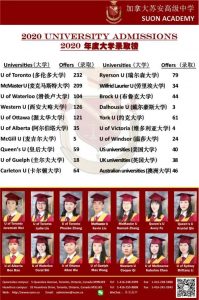与中国高考填报志愿及调档不同的是,学生可以无限制同时申报多所加拿大大学的多个专业;为了争夺优质生源,各个大学也会想尽办法吸引学生眼球,尽可能获得更多学生的申报。由于苏安高中在多伦多的影响力,每年包含多大在内的加拿大几十所大学都会来到苏安举行招生专题讲座,以吸引苏安的优秀生源。2020届苏安毕业班平均每人获8.3份offer!早在国内学生还在为高考做冲刺时,苏安学子们却面临着幸福的烦恼——到底该接受多伦多大学的录取邀请,还是去滑铁卢大学呢?