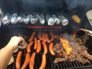 树叶坠在细枝上低垂,随着微风拂过吹起庆贺的乐声。乌黑的烤架已立着等候,打火枪穿过烧烤架引燃初始的火星,在底层铺开夺目的火焰。香肠列队摆得整整齐齐,胡椒掺杂的肉饼,孜然辣椒腌过的羊排和牛仔骨,分着区域挨个铺上炉架。锡纸包好分段的玉米竖着躺在上层凌空的架子上,独自占了整一块。