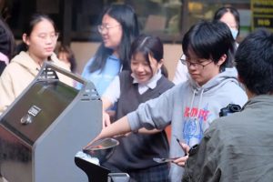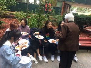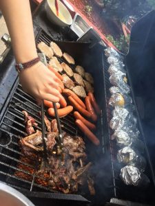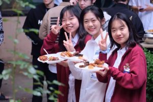 闻香而来的同学手里捧着塑料的白盘子自觉地排成一队。学生手下烤到肉汁四溢噼啪作响的肉块,被铁夹子翻动着用火焰浸过每一个分子,带着热气放进手中的盘子,等待着被同学们品尝。与此同时,校长也加入了我们,和学生一起聊天,共享美食。