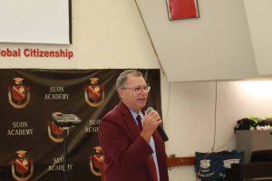 在开学典礼上,Botnick校长首先提醒学生,要感谢父母将孩子送到加拿大读书,这里有着世界上最好的高中教育。苏安高中努力把学校打造成为同学们在加拿大的家(your home away from home),坚持贯彻全人关怀(Total Care)的人才培养理念。同学们有任何问题,任何需要帮助的地方,欢迎与校长、副校长和双语班主任沟通,校长办公室的大门随时向同学们敞开。其次强调了安全的重要性。作为中国驻多伦多总领馆颁发的“平安留学奖”学校——苏安高中,Botnick 校长举例说明了加拿大高中应该进行的各种安全演习。在未来的10个月里,苏安高中将会逐个进行这些安全演习,使学生熟悉各种紧急情况下的应对措施。校长还提出了对着装的严格要求——同学们上课必须穿校服出席。对每一位苏安学子,Botnick校长希望同学们能够努力学习,只有付出足够的努力才能取得学业的成功。最后,Botnick校长代表苏安高中正式欢迎每一位苏安同学。