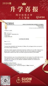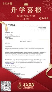 多伦多的天气刚从夏末转初秋,大学升学季刚拉开帷幕才一周,苏安高中2026届毕业班就迎来开门红:Yuze Wang, Alan Xu 两位同学分别荣获QS全球百强名校阿尔伯塔大学(University of Alberta)工程和人工智能专业的offer!